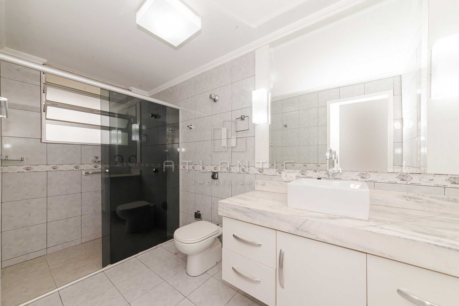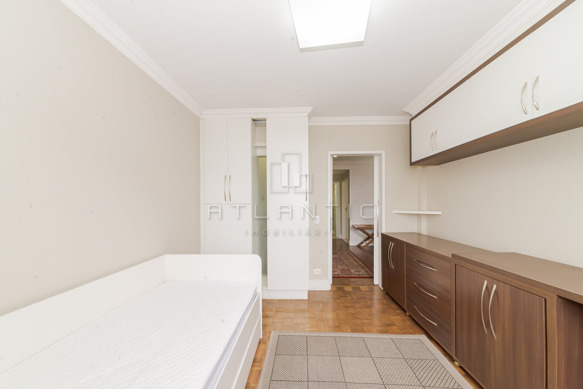 A suíte é ampla, equipada com armários planejados, cama de casal e banheiro com aquecimento a gás. O dormitório de solteiro possui armários planejados, cama de solteiro e uma bancada ideal para home office. O terceiro dormitório, sem mobília, oferece a flexibilidade para ser utilizado conforme suas necessidades.